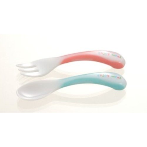 二番目は、そろそろすくってあげればクチに運べるようになってきたので、持ち手がカーヴしているほうが食べやすいかな? と購入したこれまたリッチェル製の「にぎにぎスプーン&フォーク」。